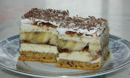 Preko banana naneti drugu polovinu fila, preko fila opet eurokrem. Staviti u frižider da se stegne, pa umutiti šlag kremu sa mlekom. Šlag krem premazati preko eurokrema, a preko šlaga po želji narendati 2 štanglice čokolade. Ostaviti u frižideru da prenoći.