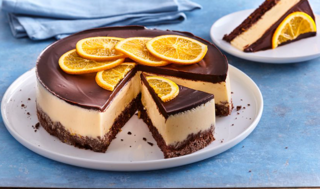 Miješajte dok se čokolada ne otopi, a glazura malo ohladi. Zatim glazuru prelijte preko stvrdnute kreme, rasporedite i ostavite u hladnjaku sat vremena. Na kraju ukrasite kriškama naranče.