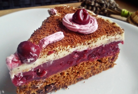 Sastojci:Biskvit:2 jaja,1 vanilin šećer,180 g šećera,250 ml mlijeka,100 ml ulja,250 g brašna,1 žličica praška za pecivo,1/2 žličice sode bikarbone,2 žlice kakaa,150 g čokolade narezane na komadiće.Krema od višanja:100 g šećera (ako volite slađe dodajte još šećera),1 kompot od višanja,2 žlice brašna,200 ml vode,2 pudinga od vanilije.Krema od vanilije:1 puding od vanilije,200 ml slatkog vrhnja,400 ml mlijeka,3 žlice šećera,30 g margarina.