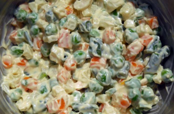 5 – 6 većih ili 7 – 8 manjih krumpira, ½ kg mrkve, 1 velika limenka graška iz konzerve, 1 velika staklenka kiselih krastavaca, 6-8 tvrdo kuhanih jaja, 4-5 vrećica majoneze, 2 žlice vrhnja, Sol, papar, peršin za dekoraciju