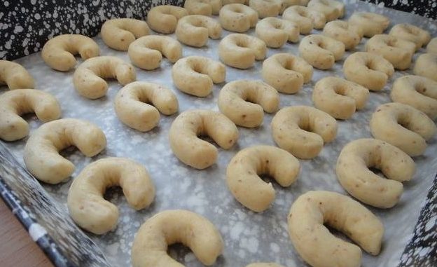 Sastojci:350g brasna (pola mekog i pola ostrog),100g mljevenih oraha ili przenih ljesnjaka,200g margarina ili maslaca,80g secera u prahu,1 bjelanjak,secer u prahu za uvaljivanje kiflica.